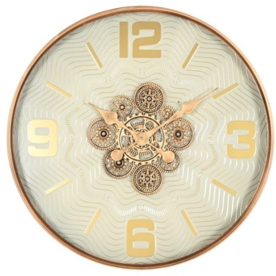 Relógio de parede decorativo com design moderno e detalhes de engrenagens em dourado, ideal para compor ambientes sofisticados e contemporâneos.